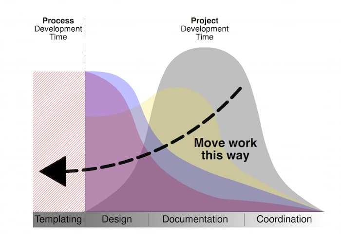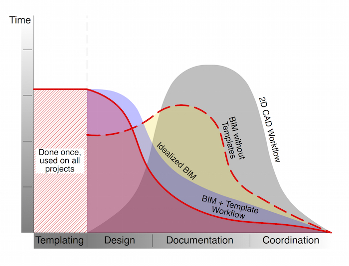 If we look at the final image in the blog post, that arrow is the key. Templates (and BIM) are about automating work and moving what you do to the left of the graph. If you are adding work to the left of the graph that didn’t exist in the right of the graph, there better be a damn good reason. If you add work/requirements to your template it needs to because of some benefit later on (time, money, value). Otherwise you’re just falling into another trap. You’re just making BIM harder and more complex for no reason.